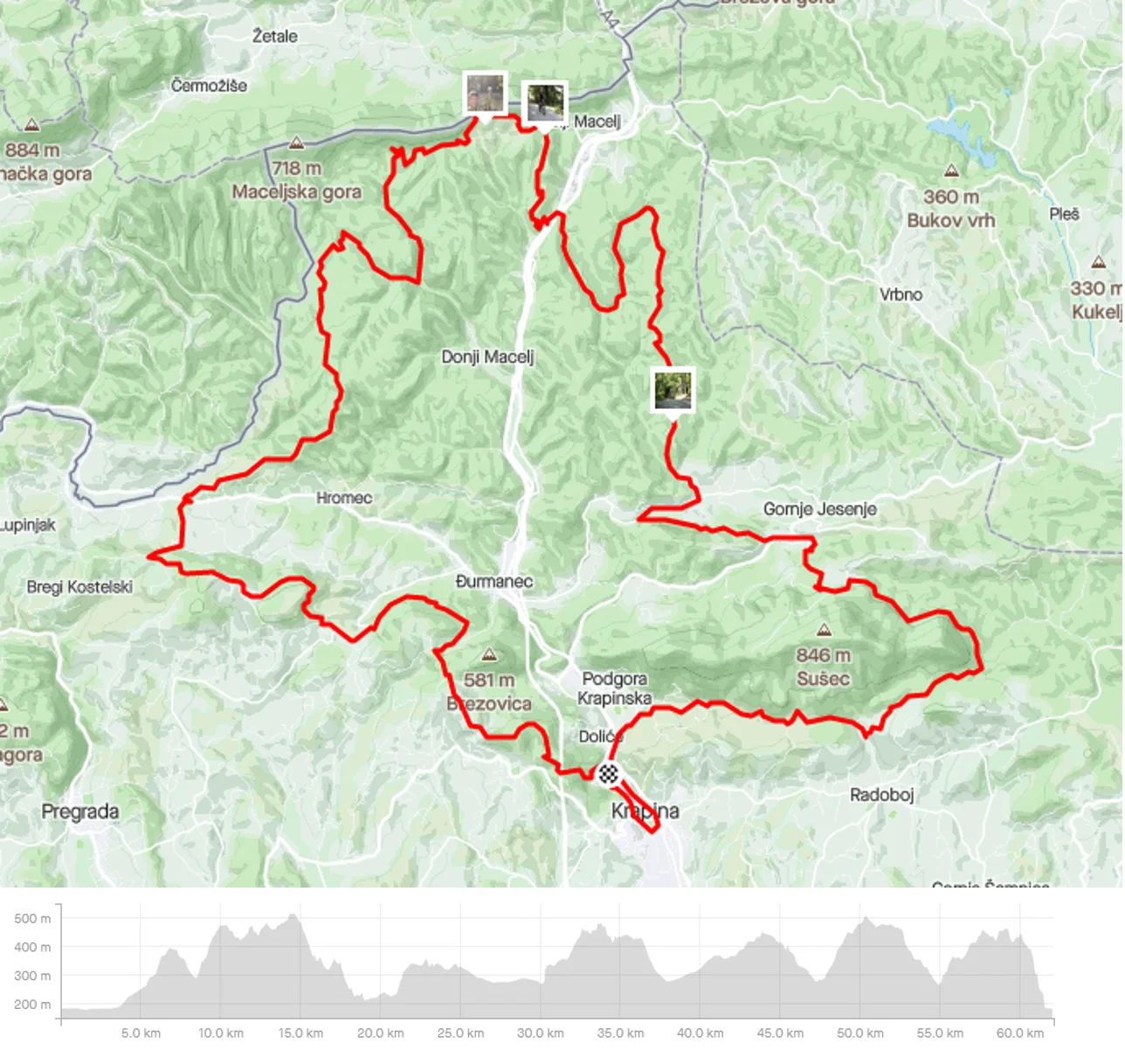 - Velika Neandertalka je kružna staza duljine cca 62km i s oko 2000m visinske razlike te prolazi područjem Strahinjčice, maceljskog i kostelskog gorja te se nakon toga preko Brezovice i Tri Kralja vraća u Krapinu.
